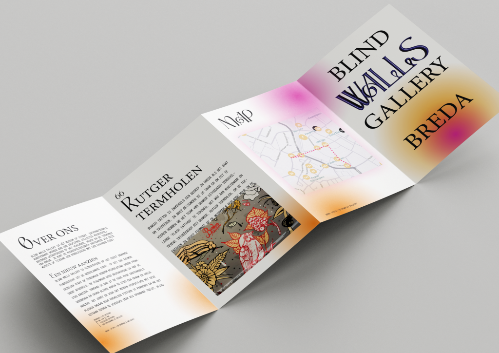 Bij Media Techniek maakten we een 4-luik folder over de Blind Walls Gallery. Eerst maakte je een schets op papier en zorgde je ervoor dat deze overeenkwam met de indeling en structuur van een 4-luik folder. Vervolgens liet je de schets aan de docent zien en lichtte je je plan van aanpak toe.